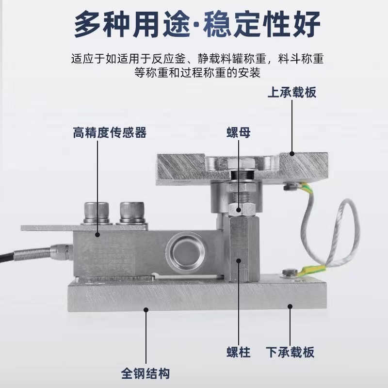 柯力防爆SB-5T/7.5T/8T称重模块传感器维修方便,若传感器损坏,可以调节支承撑螺杆将秤体顶起,不必拆除称重模块的系统既可以保证称重传感器精度高,长期稳定性好的特点,又解决了因安装不当而造成的称重误差。使用称重模块的设备测量通常能达到优于万分之五的测重精度。